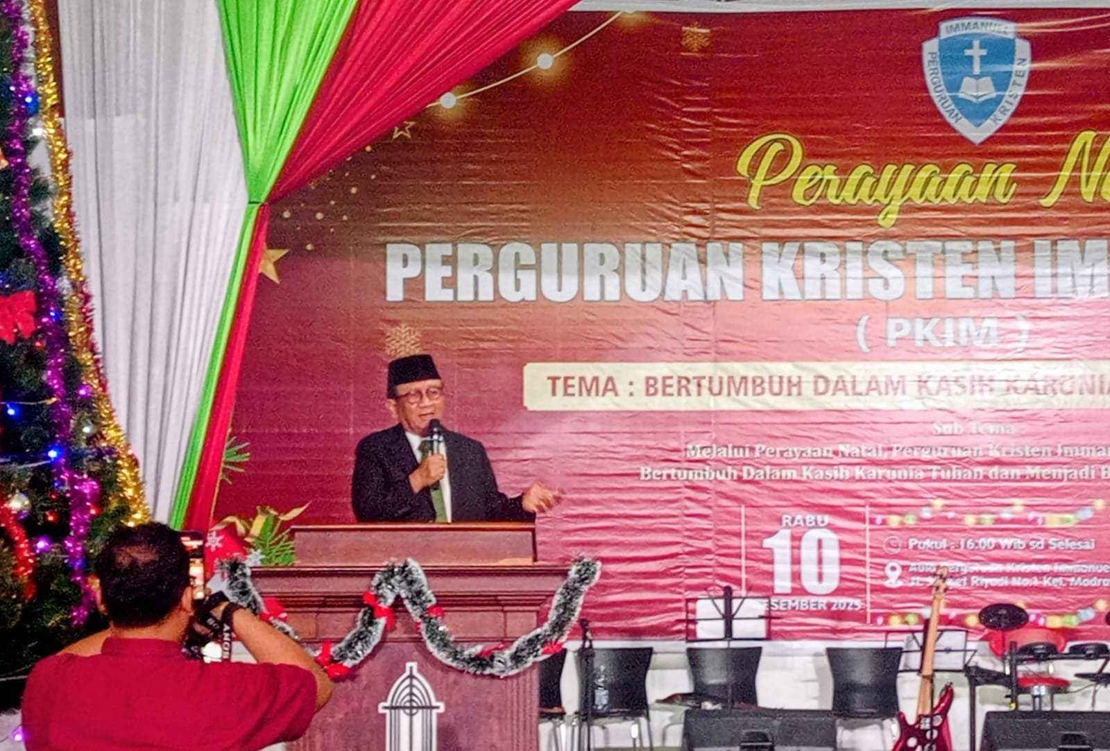 Ketua Majelis Pendidikan Kristen Indonesia (MPKW) Sumut–Aceh Dr RE Nainggolan MM menghadiri Perayaan Natal Perguruan Kristen Immanuel Medan (PKIM) yang berlangsung, Rabu (10/12/2025) di Aula PKIM, Jalan Slamet, Medan.