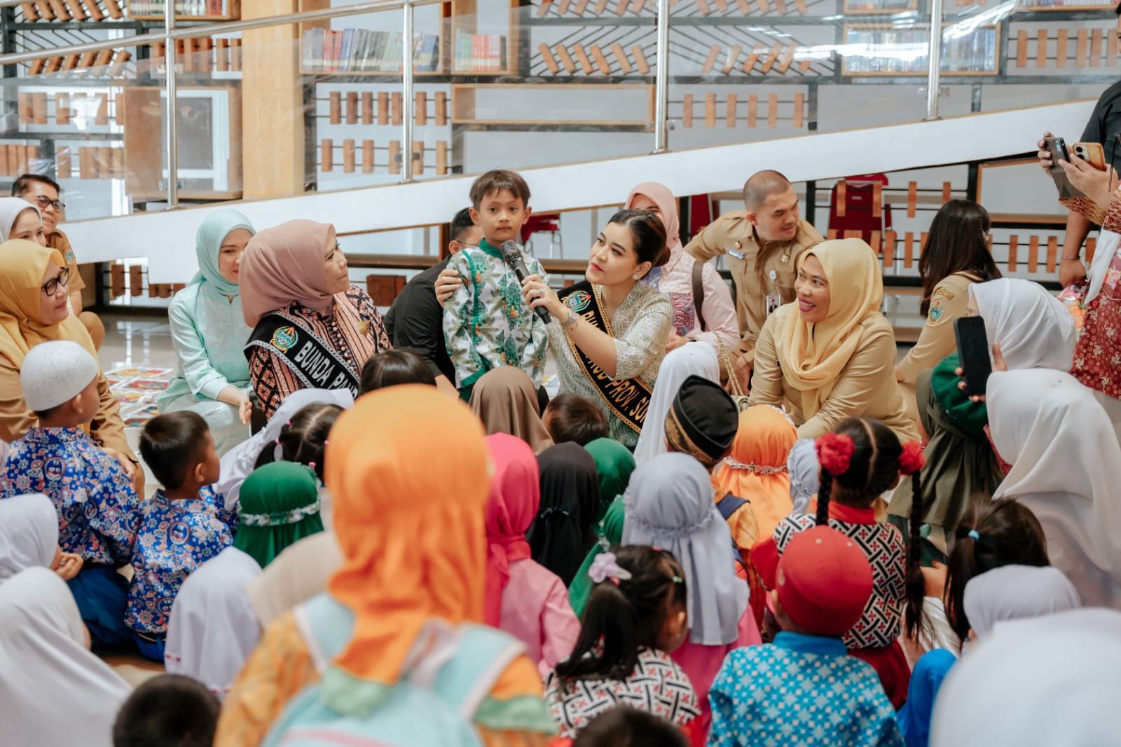 Suasana semakin hangat ketika Bunda PAUD Sumut mengadakan sesi tanya jawab interaktif dengan anak-anak. Salah satu peserta, Satria (6 tahun), berhasil menjawab dengan benar pertanyaan Kahiyang tentang “lima hewan berkaki empat” dan menerima hadiah langsung darinya.