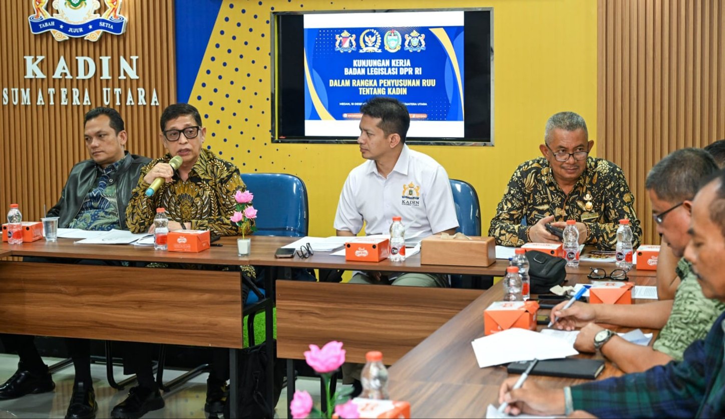 Pj Sekdaprov Sumut Sulaiman Harahap menerima kunjungan kerja (Kunker) tim Badan Legislasi (Baleg) DPR RI di Kantor Kamar Dagang dan Industri (KADIN) Sumut, Jalan Sekip Baru, Medan, Kamis (18/12/2025) siang.
