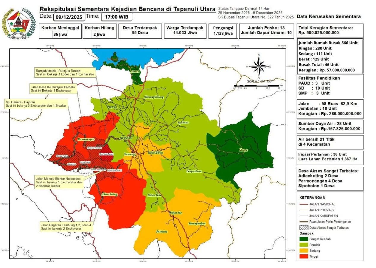 Data rekapitulasi sementara per 9 Desember 2025 pukul 17.00 WIB menunjukkan kondisi Taput masih kritis. Sebanyak 55 desa terdampak dengan total 14.033 jiwa merasakan dampak langsung. 36 korban meninggal dunia (21 warga Taput, 15 dari luar daerah), 2 orang masih hilang, 1.138 jiwa mengungsi di 13 posko.