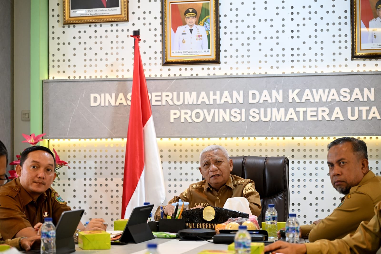 Wakil Gubernur (Wagub) Sumatera Utara (Sumut) Surya menghadiri rapat koordinasi (Rakor) bersama Menteri Dalam Negeri (Mendagri) Tito Karnavian untuk membahas kesiapan pemerintah pusat dan daerah menghadapi perayaan Natal 2025 dan Tahun Baru 2026 (Nataru). Wagub Surya mengikuti Rakor secara virtual dari Aula Kantor Dinas Perumahan dan Permukiman (Perkim) Sumut, Jalan AH Nasution, Medan, Senin (1/12/2025).